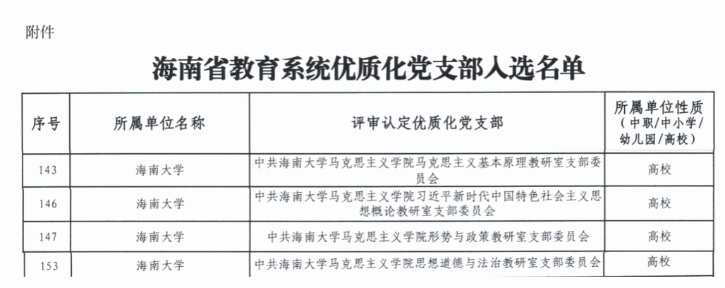 近日,海南省教育系统党支部优质化建设评选结果公布,海南大学马克思主义学院马克思主义基本原理教研室党支部、习近平新时代中国特色社会主义思想教研室党支部、形势与政策课教研室党支部、思想道德与法治教研室党支部,凭借扎实的党建工作成效,共同荣获“海南省教育系统优质化党支部”称号。